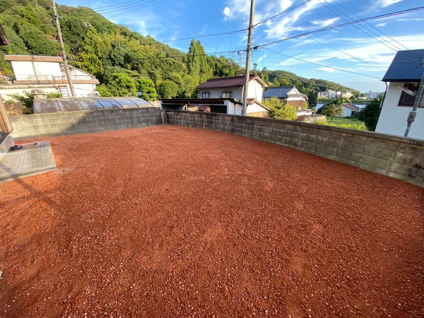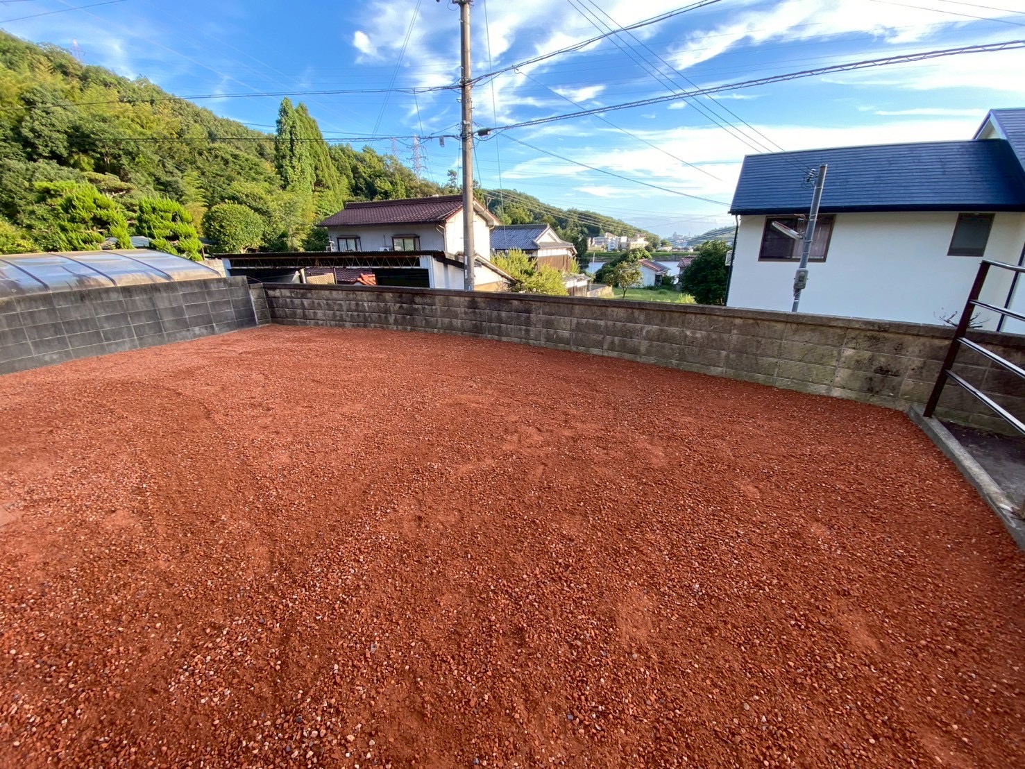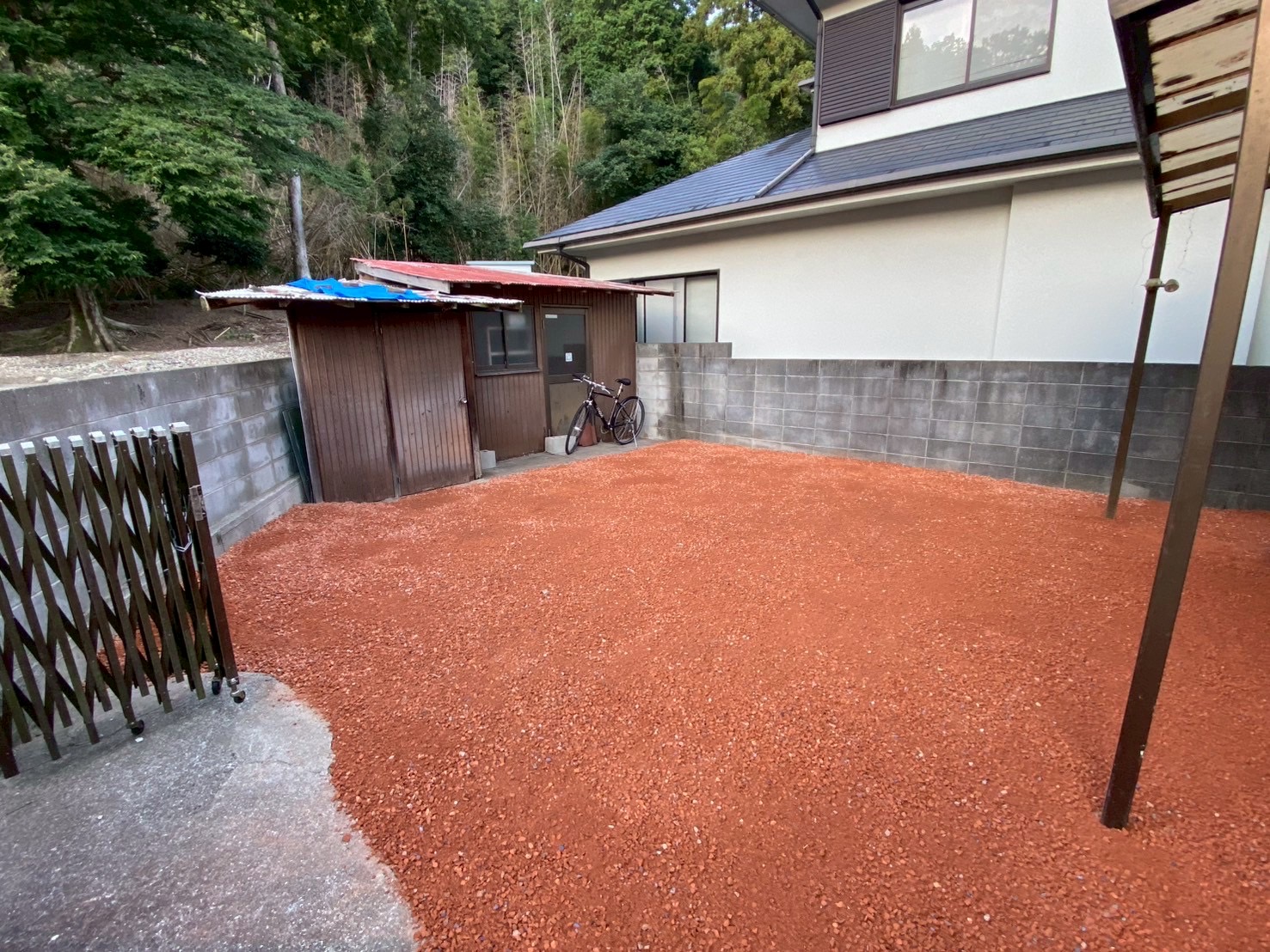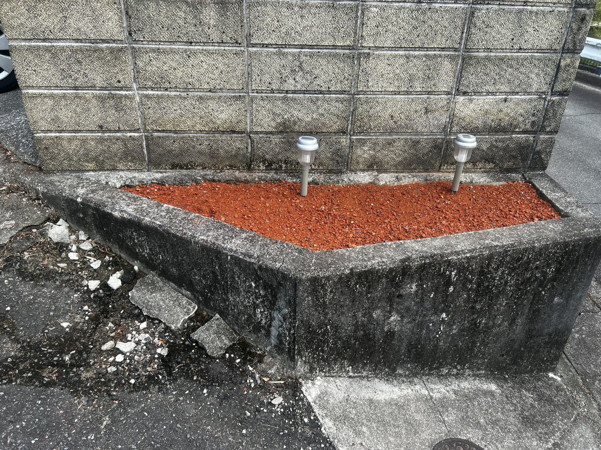 赤い瓦チップを敷き詰めて、表の庭が広々とした癒しの空間に様変わりしました。